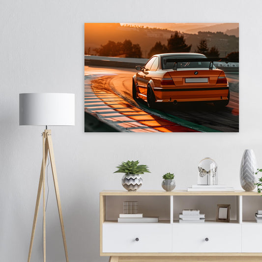 Poster E36 Orange sur Circuit au Coucher du Soleil 🖼️🚗 – Livraison offerte